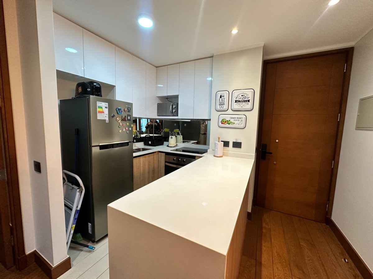 •Cocina tipo americana full equipada con campana extractor, encimera, horno eléctrico, microondas y refrigerador